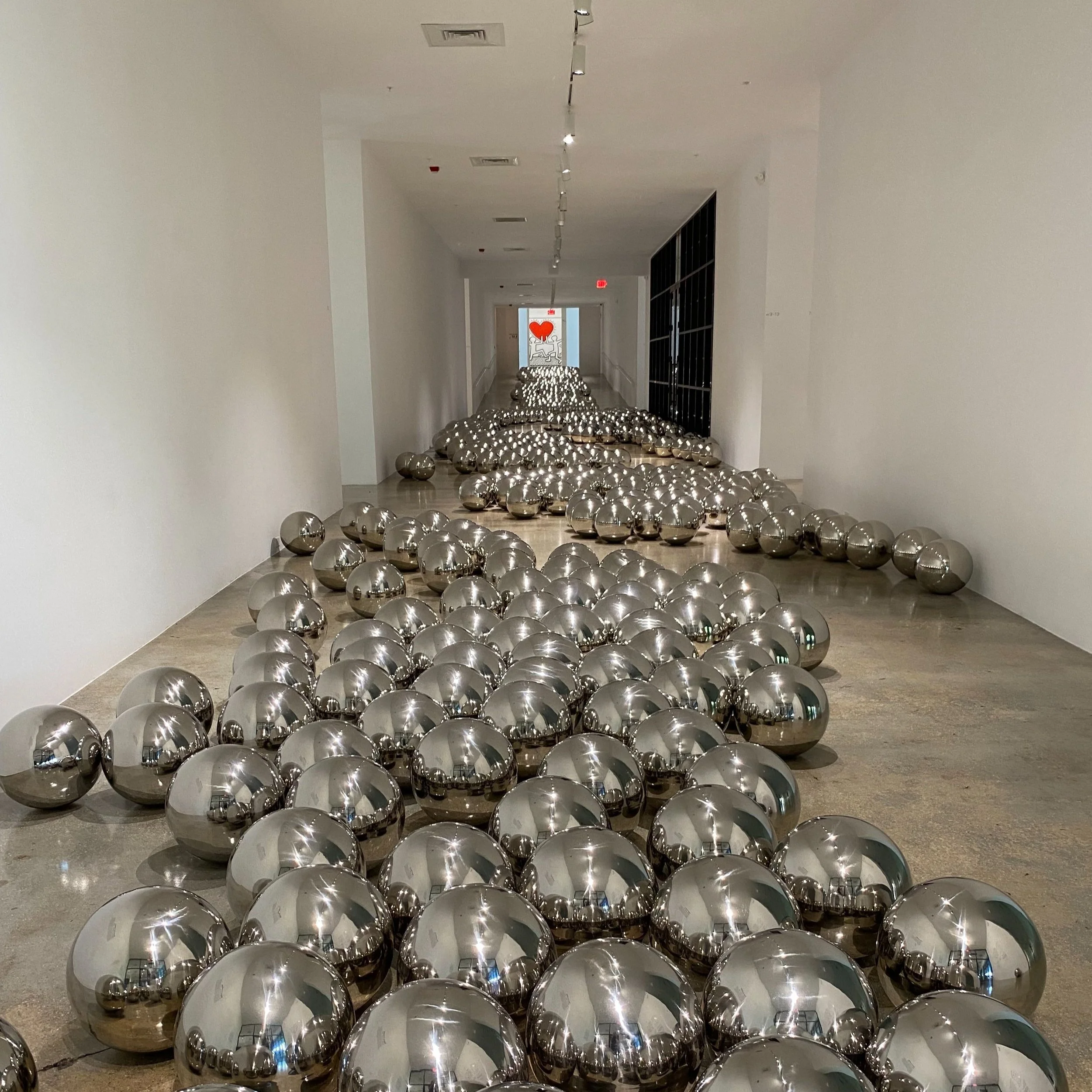 Lastly was Where the Lights in My Heart Go. If LET'S SURVIVE FOREVER looks like the inside of a space station to you, then Where the Lights in My Heart Go would look like the galaxy that your station floats through. It’s a 10x10 foot polished stainless-steel room likewise with mirrored walls but this time with small holes to allow ambient light into the dark room. What you see and experience is unique to where you stand. And I don’t only mean where you stand inside the room but geographically as well. The light that leaked in was red because of the Keith Haring piece hanging in the next room but if this were in another museum, it would look totally different.